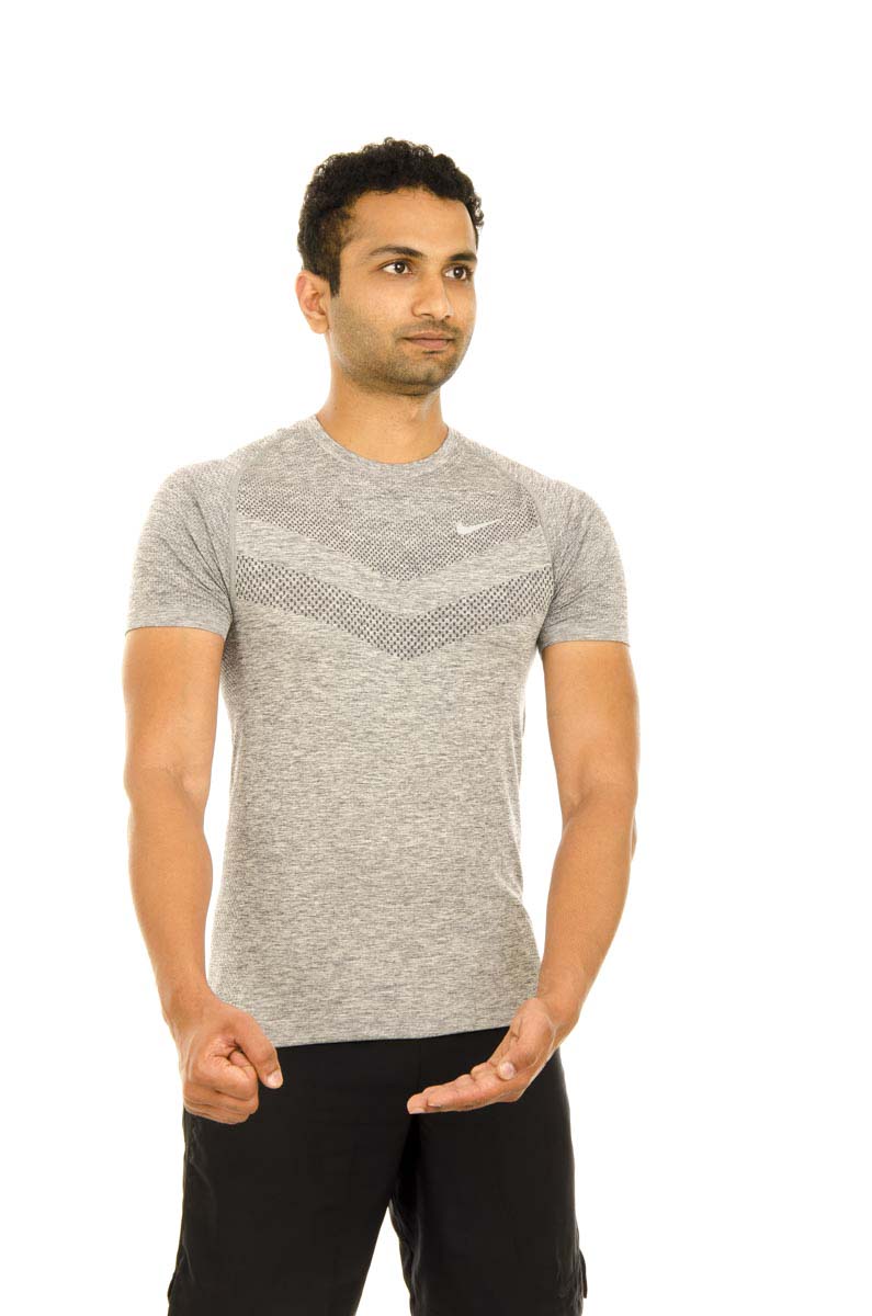 Stand with feet hip-width apart, arm elevated forward to 20 degrees with thumb pointing forward, place another hand on the forearm just above the wrist.